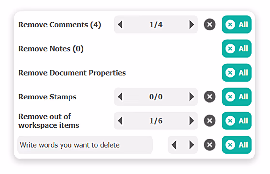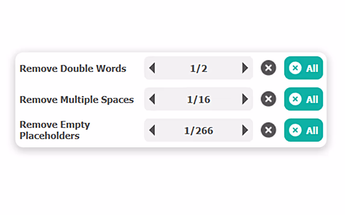 Whether you are overlooking duplicate words or double spaces, auxi Checker spots it for you. The auxi Checker tells you exactly how many instances you have the duplicates in and you can choose to delete one or all at once.