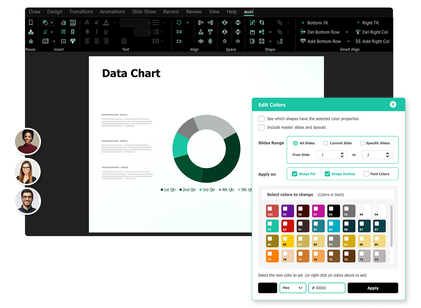 Yes, within auxi you can set pre-defined colors for based on your client's brand guidelines to present relevant, impactful decks.