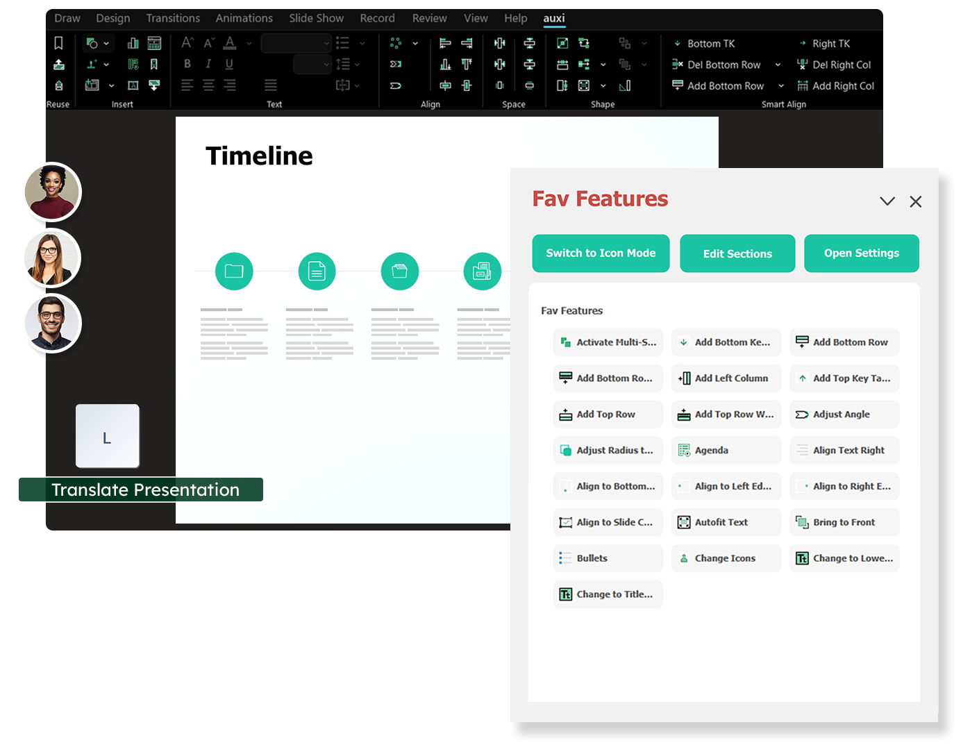 auxi works simultaneously with your favorite tools to make workflows efficient. Integrate with tools like Sharepoint, Google Gemini, and OpenAI to take a more robust approach to slide making.
